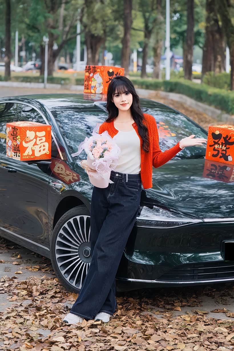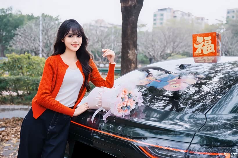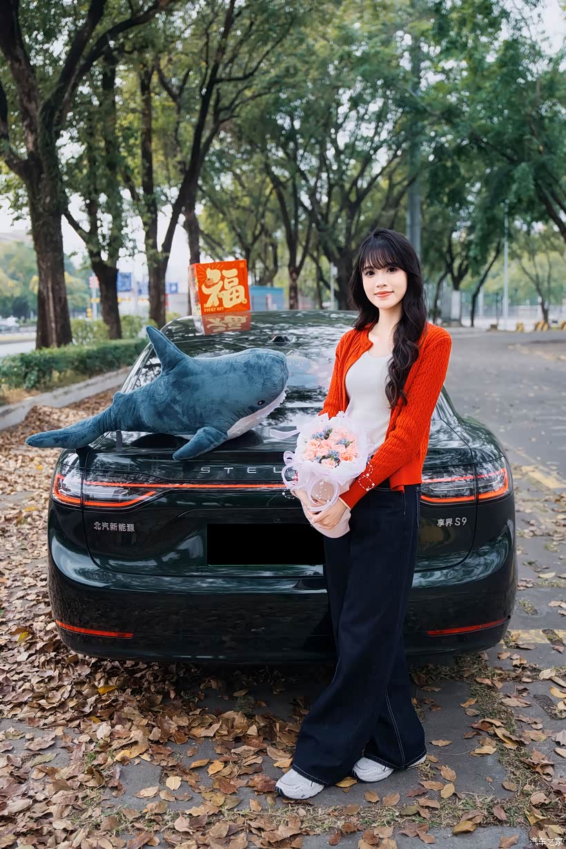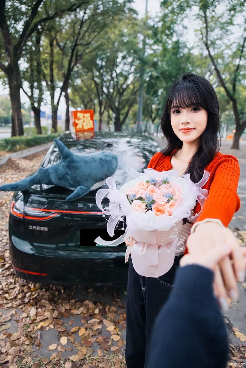 妹夫特意为妹妹准备了情人节礼物 —— 一束浅粉玫瑰和一个蓝色鲨鱼玩偶。当她穿着橘红色的针织开衫,手持彩色的马年装饰,站在享界 S9 旁时,浪漫与科技的交织,让整个画面既有新春的喜庆,又有情人节的浪漫。