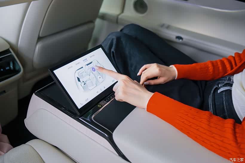 扶手的操作屏很细节的可以调整角度,除了能控制车辆的一些信息和功能外,还是投影仪的遥控,操作很方便也不怕遥控丢了。