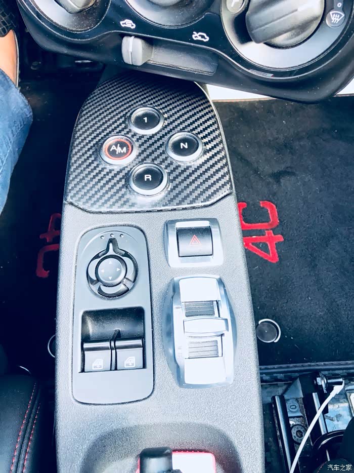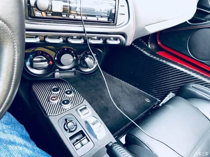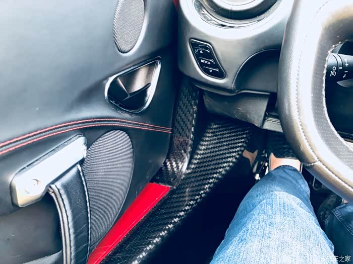内饰方面其实表现的也不错了。黑皮红线,另外由于减重用了大量的碳纤维,真个格调也是很有冲击感,很和谐。整台车的控制和一般超跑差不多,没有档把,由中间的N键R键等控制档位,往前的话拨一下右拨片。没有p挡,停车直接是N挡+手刹。