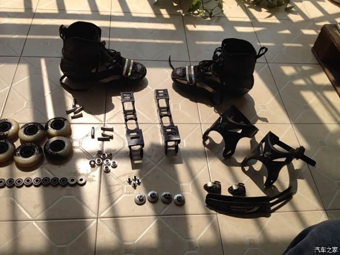 从我直排轮开始,已经被我拆散的封存起来了。刀架改的seba刀架,鞋体本是蓝色,我自己用丙烯颜料刷黑后看来起来更像碳纤维材质的。