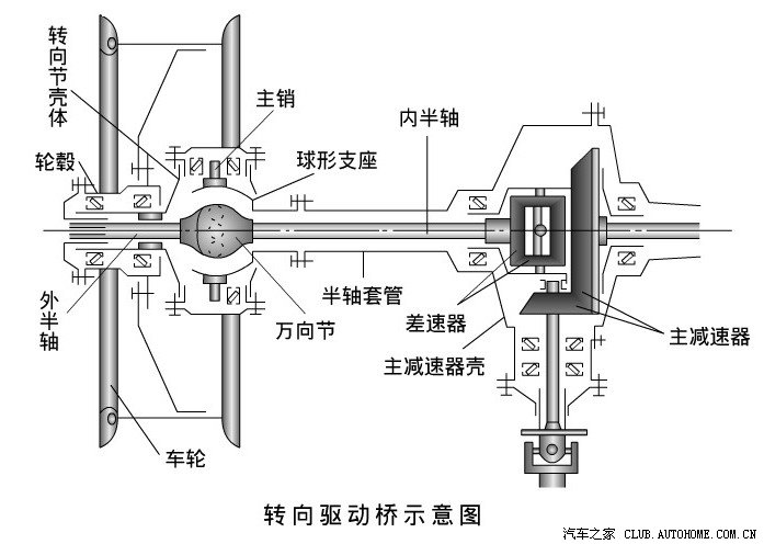 前轮轮毂固定在转向节上,汽车转向时转向节绕主销旋转,带动前轮绕主销旋转。转向驱动桥为了将动力传给前轮,又能使前轮偏转,必须在转向节内加装万向节,且主销的轴线必须通过万向节中心,以确保不发生运动干涉。