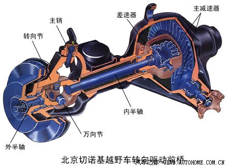 在进入到各角度前,先来了解下驱动桥的基本构造。许多轿车和全轮驱动越野车的前桥既是转向桥又是驱动桥,称为转向驱动桥。转向驱动桥主要由主减速器、差速器、万向节、转向节、主销等组成。