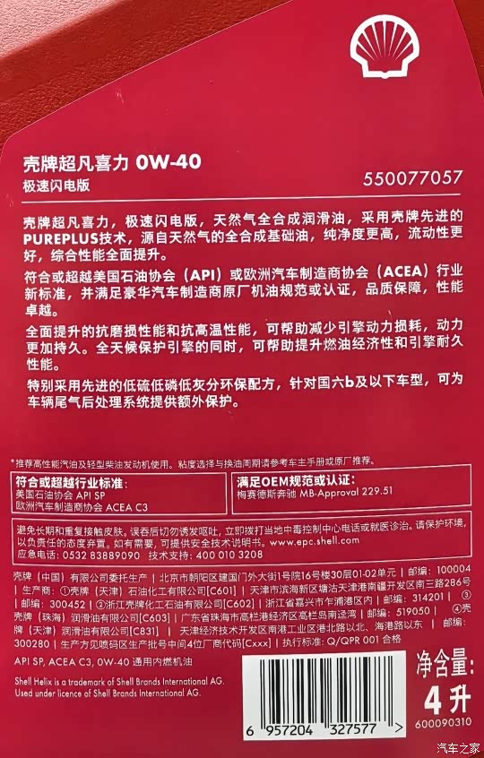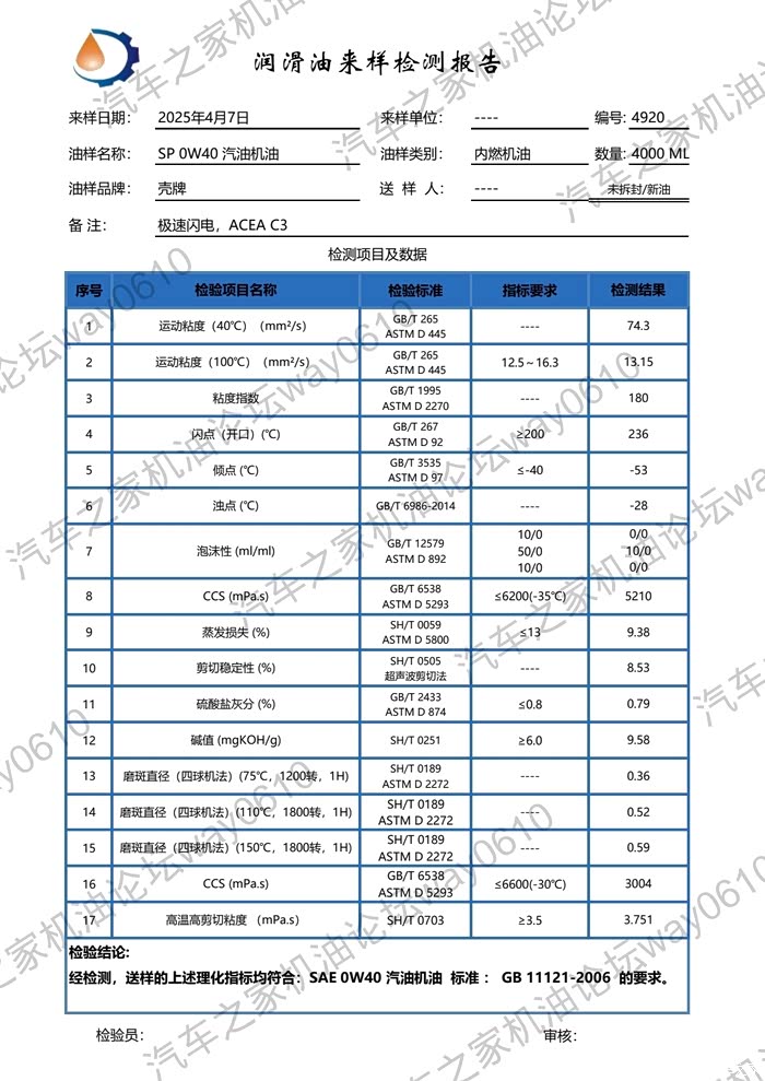 这次检测的是极速闪电系列0W-40标号,最新API SP认证,ACEA C3低灰分机油,可用于国六带颗粒捕捉器的车辆。