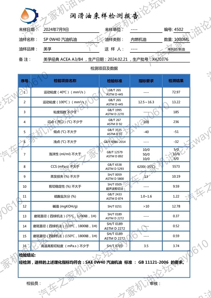 检测只对样品负责,检测为个人兴趣爱好,数据请谨慎参考,样品由论坛车友提供,4升装未开封新油。