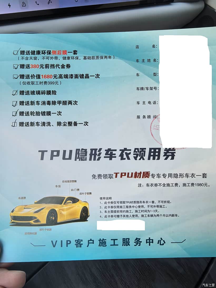 7、对了,忘了主题了,买车的时候送的贴膜和车衣就是一个大坑,提车时4儿子送的贴膜卡是一家与他们不相关的店,说是免费送,到贴膜店,先是给你看赠送的,与店里推荐的一比较,心理落差太大了,就忽悠着你去升级,相中的最次的也得一千多,赠送镀晶但是要工时费399元,赠送车衣但是要工时费1980元,不贴还不能带走,赠送的洗车消毒除甲醛也是糊弄事,后来听圈内人说,现在说的好听是赠送,其实是4儿子给贴膜店拉客,每单还有提成,不知是真是假。