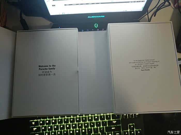 打开盒子之后是对开样式,一封印有保时捷标志的文件上面写着尊敬的保时捷车主XXX欢迎成为保时捷家族的一员之类的,最后印有保时捷高层的签名,仪式感满满,也许是钱花到位了,感觉车主礼遇都好很多,至少我在奔驰4S店购车是没有这样的体验的。传图不知道为什么很不清晰。