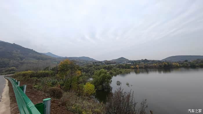 路边的水库与染红的树叶勾勒出一幅美丽的山水画