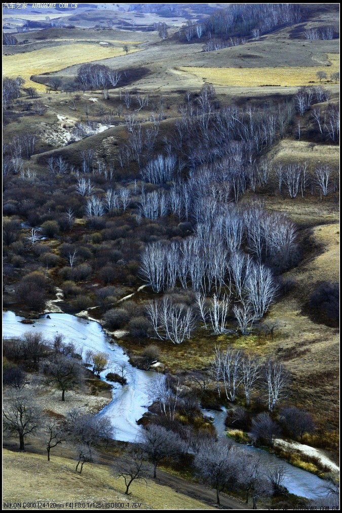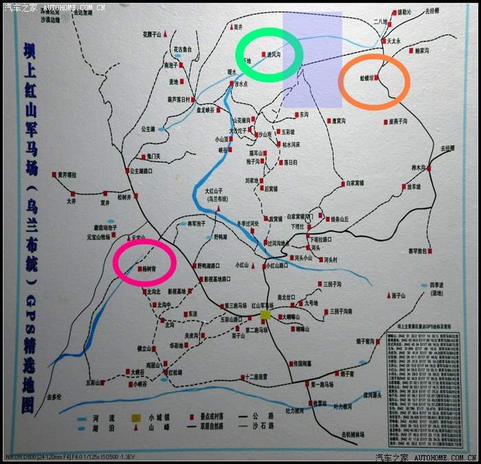 绿色圈透风沟(也有叫通风沟的)是第二天拍晨景的地方,比较好找,从公主湖那条路往里走;红圈蛤蟆坝是著名摄影地,原计划去的、最后没时间去了;紫色是无名之地,越野车可以过去,我们在那里转了很长时间,景致不错的、野地开车驰骋会很爽的!包括东沟北沟等其它地方都不错的,原来都去过、所以这次木安排。