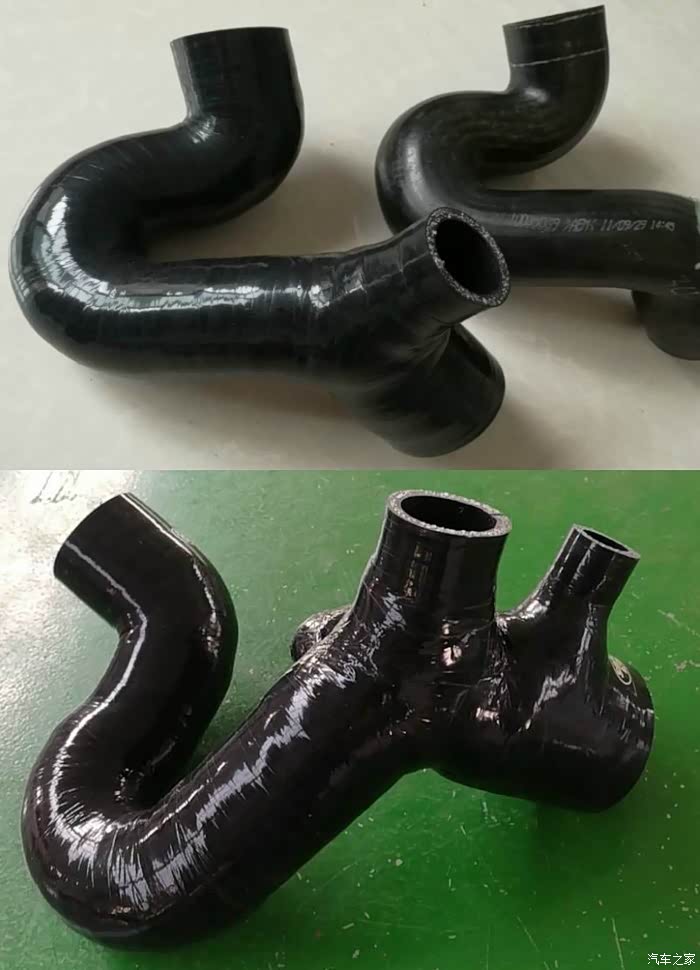 1、对涡轮前胶管的优化,如图一中的涡轮前管:原车管为1号、我优化的管为2号。