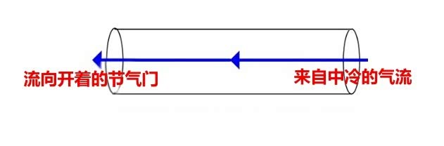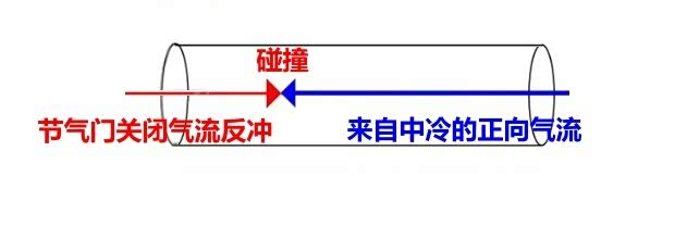 节气门关闭时,两股气流碰撞,产生气噪,当节气门再次打开时这股气流由于碰撞的原因会减少,发动机性能随之降低,如图: