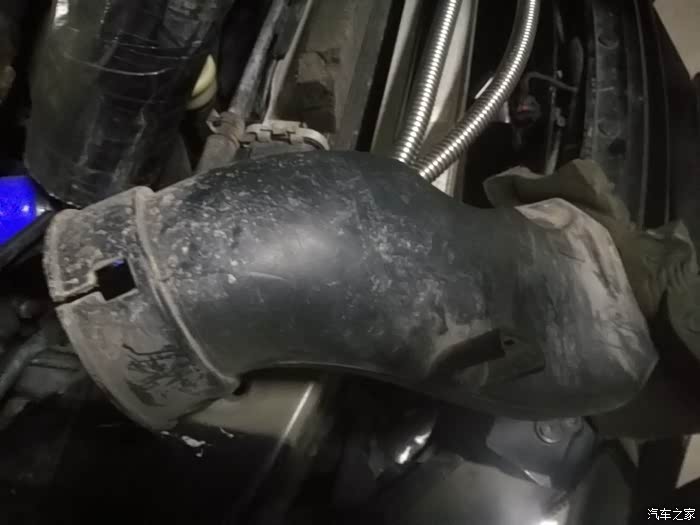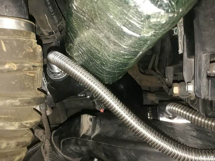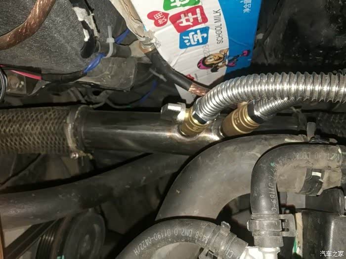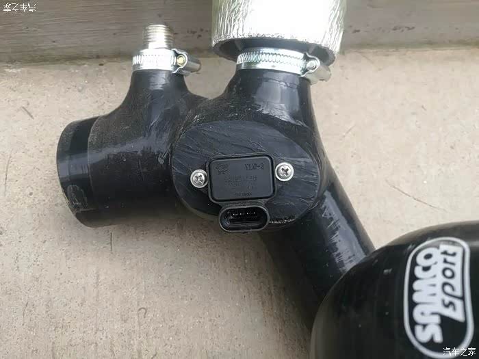 第一,直接从涡轮后、中冷器前的金属管30度角(30度角的目的是便于空气气流进入)引出了一条内径16毫米外径20毫米的旁支管,直接再30度角并入到中冷后、节气门前的管子中,我叫它为B管,管子使用散热效果的波纹管,两头与焊接在中冷前后金属管上的螺丝连接,一管到底,无接头少气阻;波纹管可随意拉伸可随意弯转,方便使用。安装后的效果可以借用 车友顺德-138-帅哥中的青蛙 的分析:“假设这个旁支管可分流10%的高压气体流量,且瞬时压力为10。那么流经中冷后的剩余90%的压力为6的气体,跟10%的压力为10的气体,混合后总体压力不考虑温差,用加权法简单概算约为:90%*6 + 10%*10 = 6.4。也就是说可以提升约(6.4-6)/6 = 6.7%的进气压力。当然以上数值纯属为定性推论而设定,并非准确的定量实验数值,但可以肯定,本身这种旁路一小部分高压气体不经中冷直接引入到节气门前混合实现增压的简易改装 ,只要旁支管的阻力小于中冷的气阻,那就一定是可以提升进气压力的。”也就是说可以增加节气门的进气量,提升发动机性能。