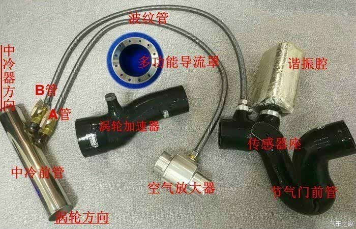 综上所述,低负荷时即起步与低速时涡轮不介入或介入浅,进气少需要气流细而快,这时涡轮不介入增压,中冷前管不产生高压气流,空气放大器是不起作用的,主要依靠中冷、直通管B和放大器高压管A向节气门输送空气,很显然这时候直通管B是起作用的,这也正是我在实验中增加B管后起步低速和升降档积极的原因。 而大负荷时节气门大开,大进气量大流速,中冷前压力增大,空气放大器介入发挥作用。