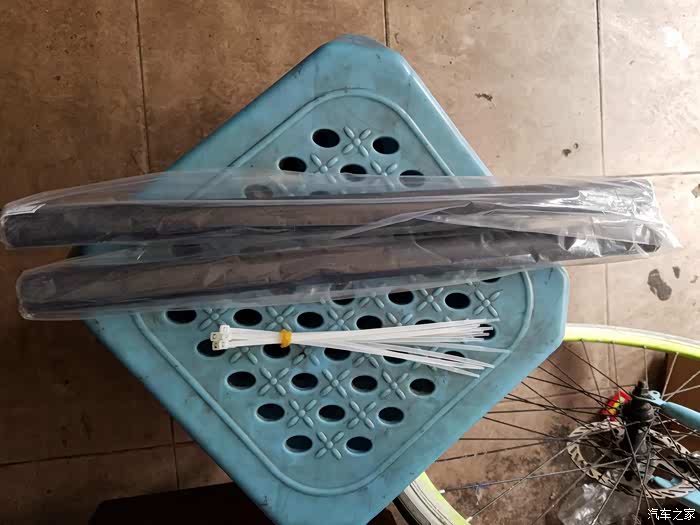 ↑拆开后,用扎带把已经打孔的碳纤管固定在前杠支架上,可利用的支架部分大约长88CM,可以绑上2根43cm管