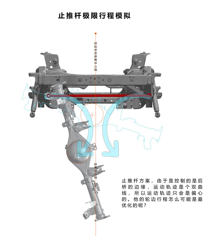 一定会有人说,超限了怎么说,是不是就不如止推杆了??这个基本不可能出现,因为后桥的运动不仅仅受限于瓦特连杆的运动行程。还受限于减震器,四连杆,平衡杆等诸多结构的限制。这个下面有照片,一会可以看到。