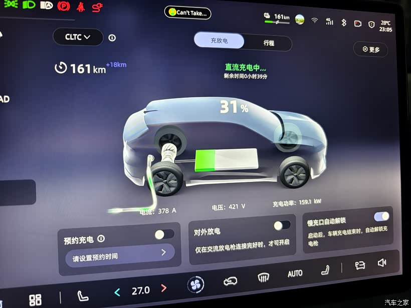 晚上到柳州市区,顺道去充个电。插上枪,屏幕上的功率数字跳得飞快,最高冲到了160kW。我从27%的电量开始充,到98%自动跳枪,总共用了33分钟,充进去44度电。