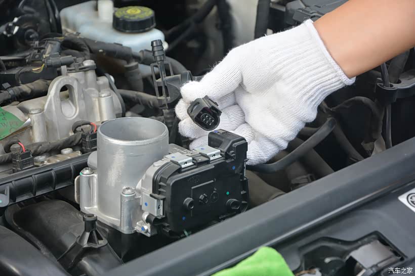(7)按照刚才拆卸的方法回装节气门(对准孔位拧紧螺丝,插上线束插头、安装空气进气盒、连接气管接头);