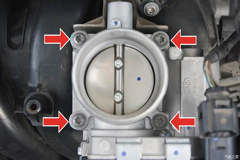 (4)使用星形螺丝刀拆卸节气门四颗螺丝,螺丝拆卸还是很轻松的。