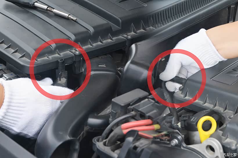 (2)拔下与空气滤芯盒连接的气管接头,向正上方用力拆下进气滤芯盒总成;