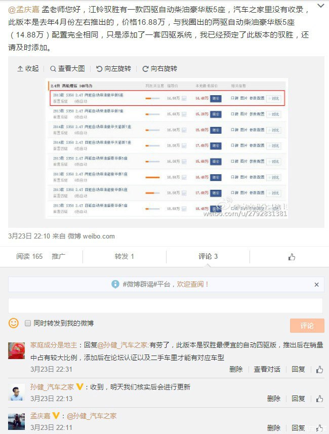自四豪五这款是驭胜上市后过了一段时间才推出的配置,汽车之家的车型表里没有收录,在我@之后很快就添加上了,态度及反应速度给个赞