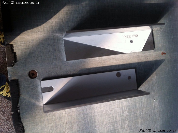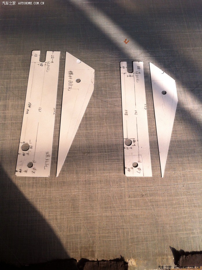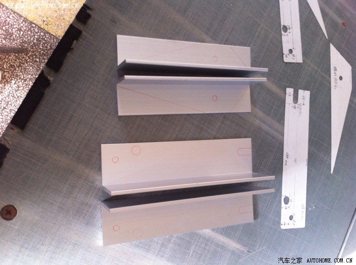 制作过程:1纸片制样对孔位 。 2把角铝切好长度,前180后200(如角铝是4x50x50则前切掉下边缘10,后切掉下边缘3。 3纸样成型后放于角铝上下边缘对齐画出切割点与孔位(左右分清)。 4切割钻孔去除多余(左右分清)。 5锉刀锉去菱角(可以避免划伤车柒)。 6做好铝片安装于原行李架上并上螺丝看是否匹配(如不匹配再微调孔位) 。 7橫杆用于对准车头的一面凹槽上贴一条胶带降低风阻。 8完工安装闪亮登场。(备注:铝材店多种多样铝材选自己喜欢的,附上尺寸图片供参考,如对此标注孔位不放心,建议先用厚纸片做样放车上比对孔位,进行微调,螺丝孔位如果钻大了可以安装时加垫片,橫杆与原行李架交接处贴上厚胶带,这就是无损安装)