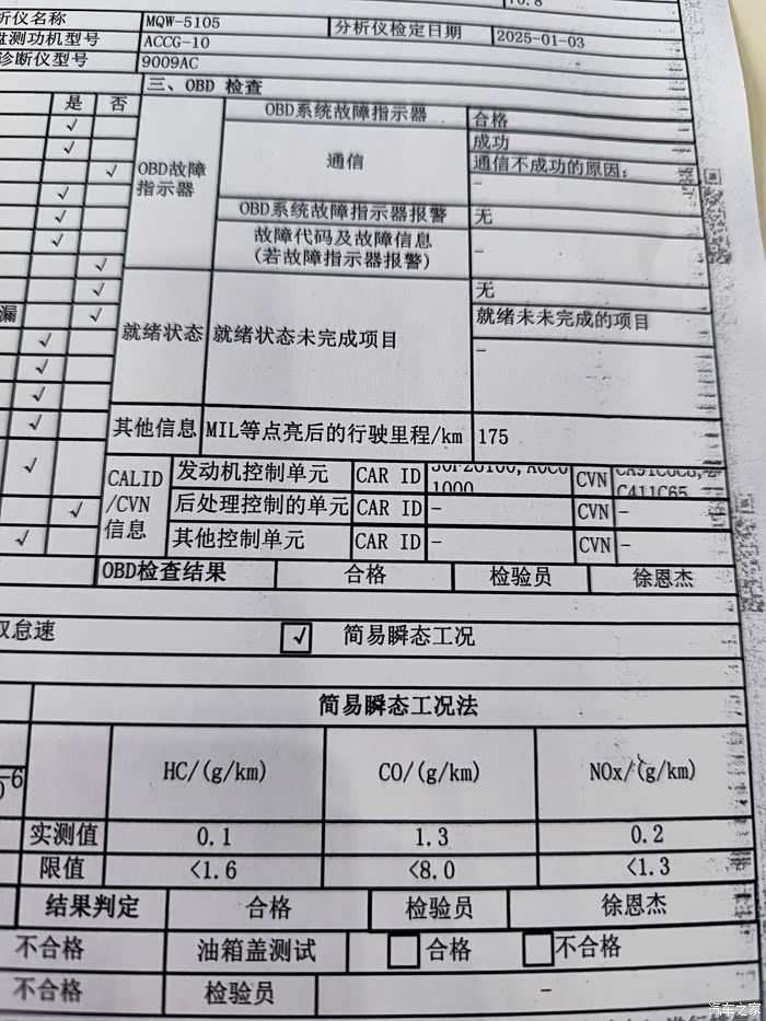 我2012年9月的车,当年是核准尾气国5标,今年10月刚刚年检,用的是OBD检测,检验指标比去年差不多提高了一倍,