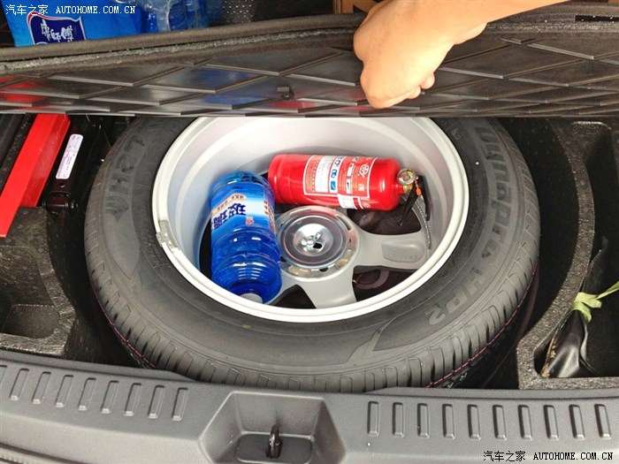 备胎,懒得把上面东西拿掉了,大家将就着看吧,灭火器实在不知道固定在哪里,放在后备箱总是到处飘,干脆扔下面了,还有工具。个人觉得如果备胎上面有个带工具槽的盖子应该更完美,也不怕上面那薄板不牢靠了。