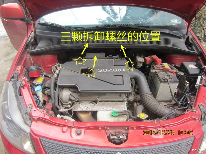 2、打开前盖,准备拆开发动机外盖,找到三个固定螺丝的位置。用10号套筒拆除。