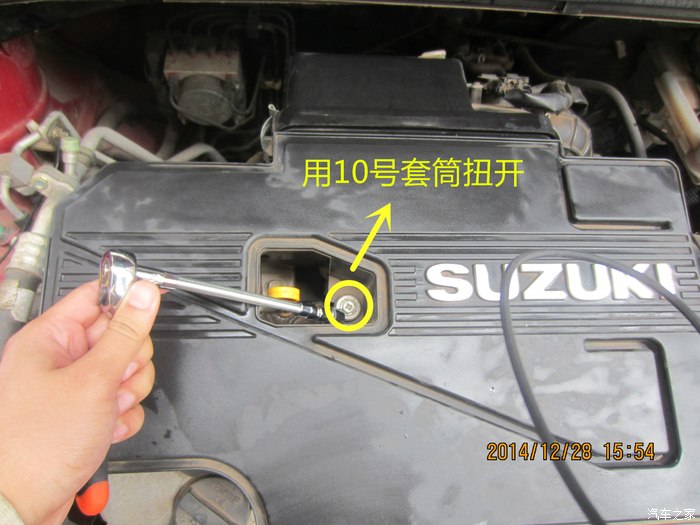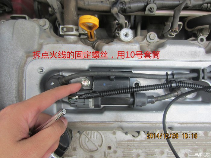6、拆点火线的固定螺丝,用10号套筒,并拔出点火线头。拔线的时候千万记住要捏帽子下方的中间位置,千万别扯电线,也别扯帽头,都容易坏。