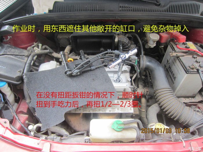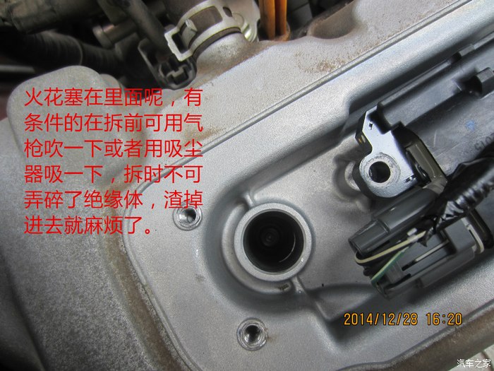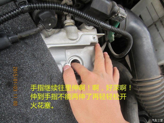 10、取出旧火花塞后立马把新的火花塞换进去,最好不要全部拆出再一次更换新的,这样有杂物掉入缸内的风险。安装新火花塞时要注意放入火花塞的手法,别一下丢进去了,缸内很深,容易摔坏火花塞,看我妖娆的指法~