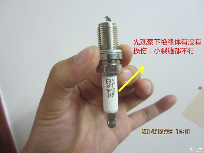 打开检查火花塞,着重检查两点:⑴陶瓷绝缘体有没有损伤,一点点裂痕都不行的;⑵点火口是否完好,没有压弯。