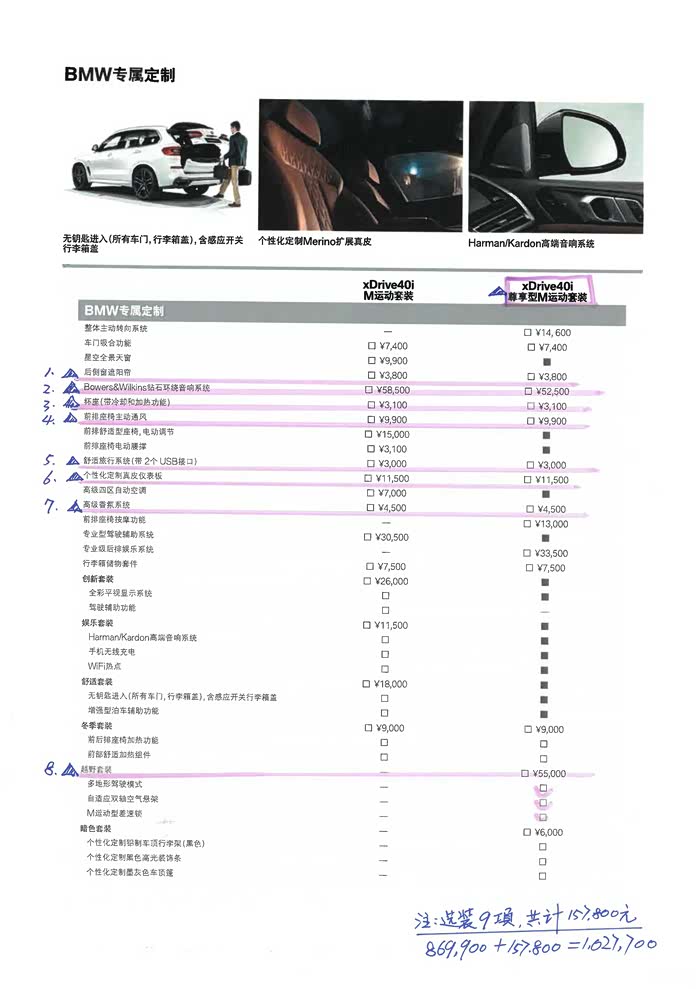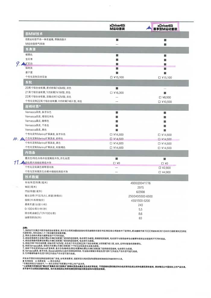 表里面打三角的是尊享自带的,所以我还是觉得从尊享上面加更具性价比,毕竟多了自动四区空调,星空车顶(这个无所谓),舒适套装,还有专有的M高性能卡钳,辅助驾驶等等)