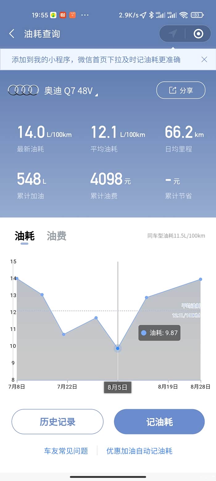 7/1提车到今天也正好两个月了,大约开了4300公里。车显油耗12.2,我觉得大致是准确的,因为我在V 信我的车里也记录了我的油耗,如下图