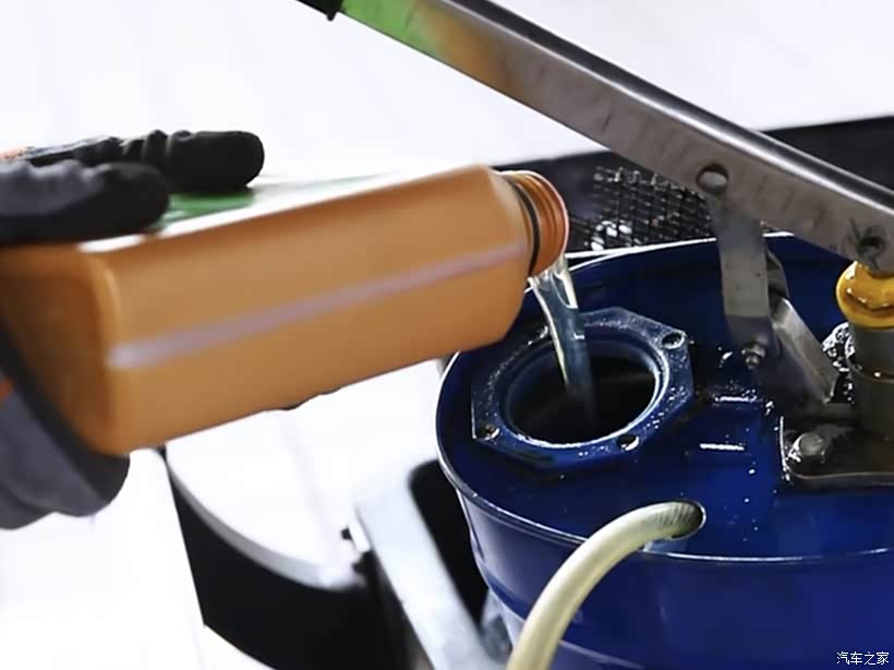 第二步:更换变速器油液。拧下放油螺栓,把废弃油液放掉,放完后,拧紧螺栓,把新的变速箱油倒入加油器中,用加油器把油加进去。操作完成后,把变速箱护板装回去。