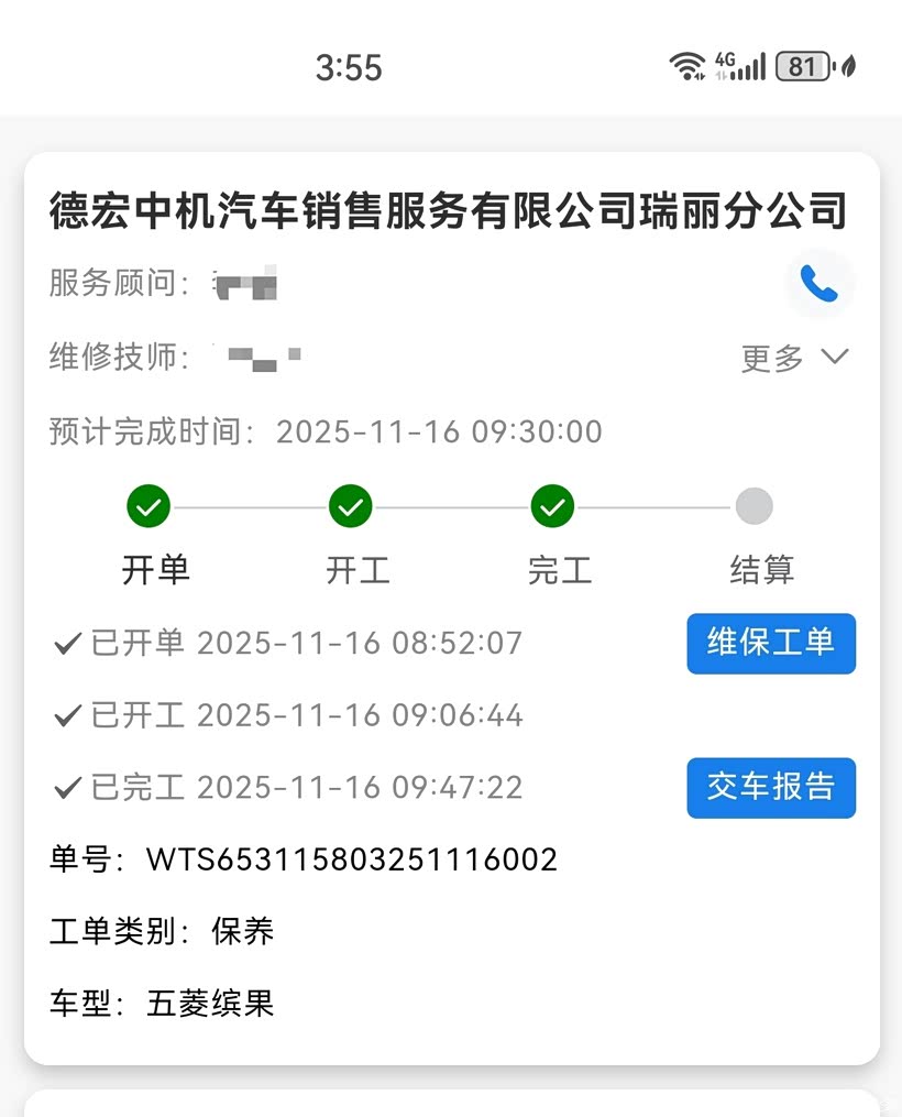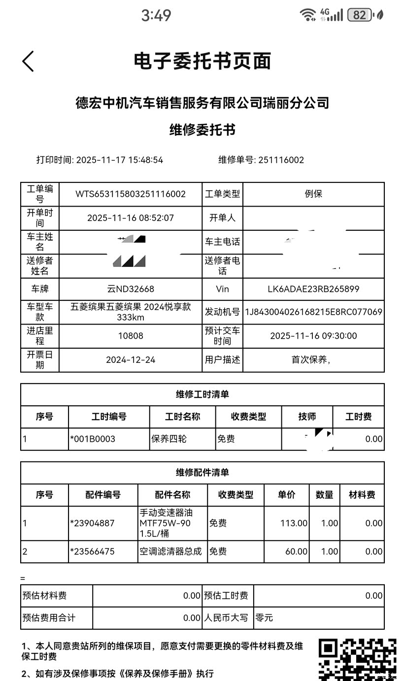 2024年12月购买的五菱缤果2024款333km悦享款,行驶10800公里的时候,4S店就不停地打电话来提示赶紧去保养。担心不按期参加保养会影响质保,所以我就及时公把车开进了4S店售后服务中心进行二保。