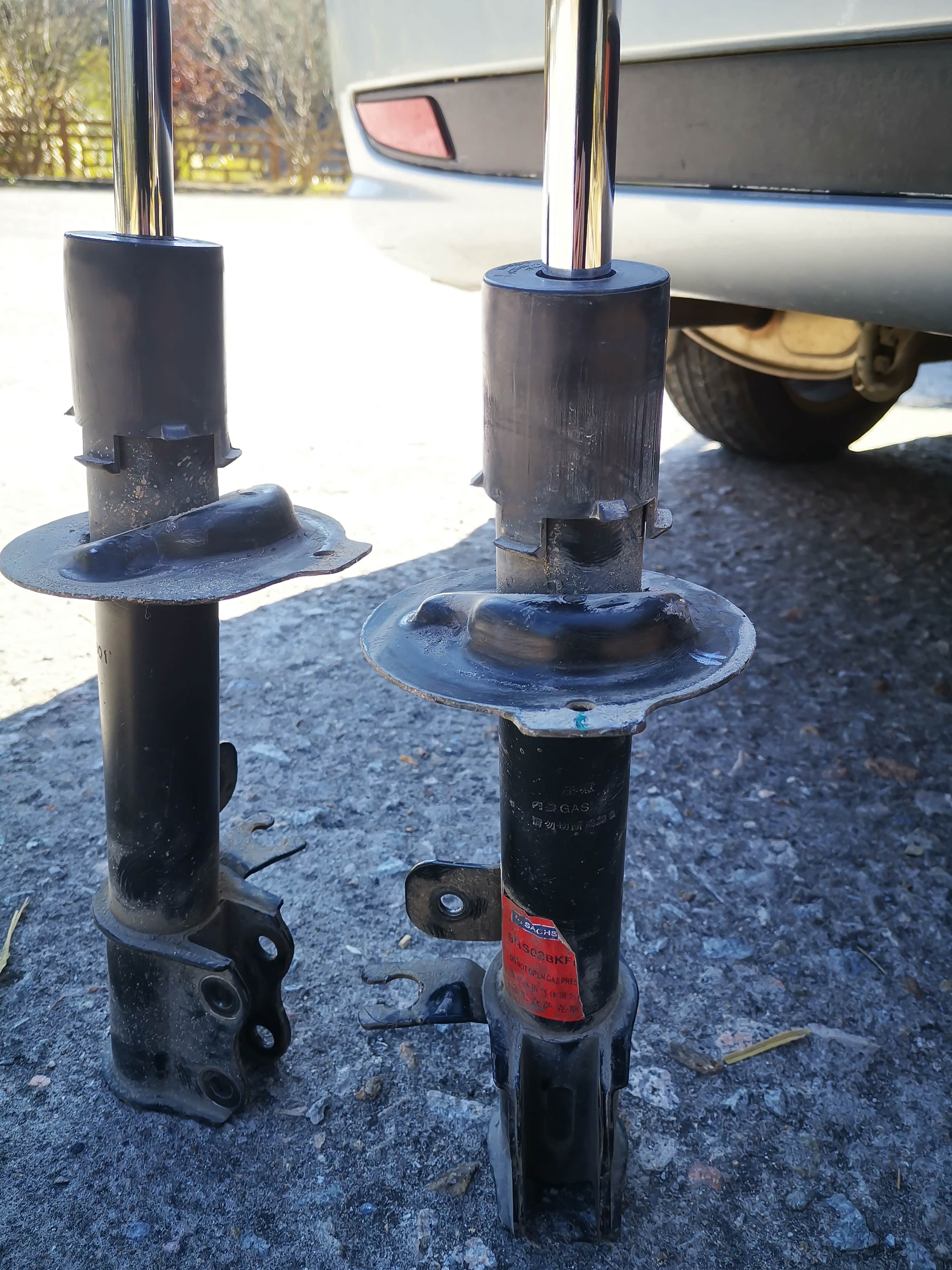 拆下来后,发现原来两条居然是萨克斯的。(半年前在闲鱼买的二手,对方说只轻度用了一年),这对萨克斯外表没漏油,但是避震里面就感觉是没气了,压下去起不来,简单用手就能来会压缩那种。