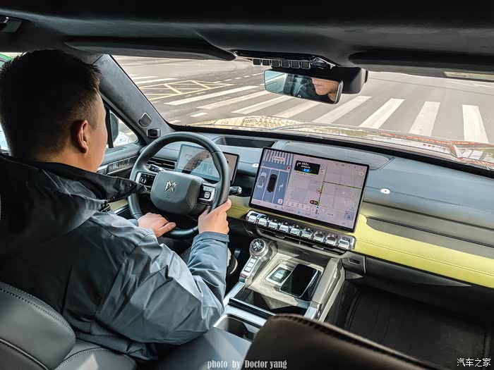这个特别有个性的带屏幕的设计,官方称之为飞航旋钮,据说是来源于战斗机的操作按键,不过我倒是觉得像是一个手表的表盘和表带,它的主要作用是用来调节驾驶模式,调节的时候中控屏上也会实时显示,这就类似于一个手机的快捷键,对于一台越野车来说还是非常实用的,不用低头就能直接操作。