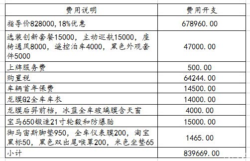 有关选装:订车时选配了创新套餐15000,座椅通风8000元,主动巡航15000,黑色外观套件5000,还有遥控泊车4000元。因为这次订的运动版,加上这些选装基本满足了以前没用过的丁字裤方向盘,座椅通风,遥控泊车。没有选装全速段主动巡航,因为实际高速驾驶时还是喜欢自己控制车速,定速了还是不够智能。个人不太喜欢大部分7系的817的20寸轮毂,还是就是原装19寸的,到车前请搞轮胎的朋友买了一套650的21寸原厂锻造鼓和库存时间比较长的防爆胎,看着大一些的,不知道实际使用会不会经常鼓包,尽量注意点吧。创新套餐也不记得是哪些内容了,是不是360全景等。