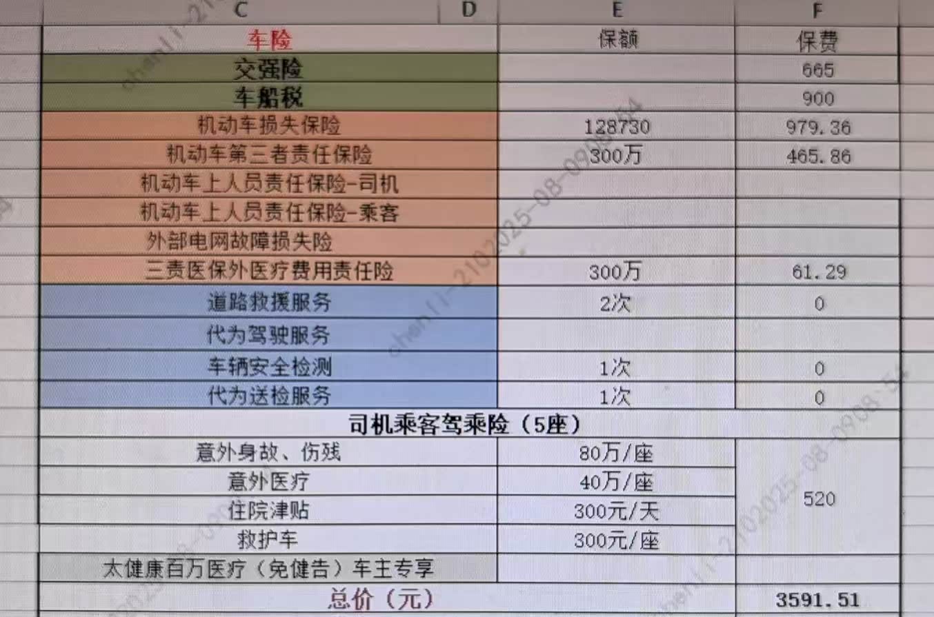 1、保险费:共计3292元,其中商业险:1506.51元,意外险:520元,交强险:665元,车船税:900元,最后优惠300元。