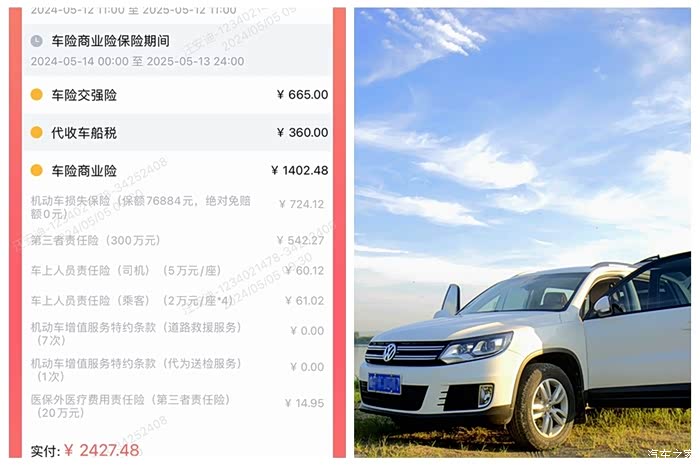 (二)、车辆保险(含车船税):一共2427.28元,包括交强险665元、车船税360元,商业险1402.48元。
