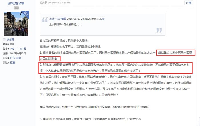 这事儿还真不好说. 我个人觉得不排除那批货有问题的可能, 但是从曝出来的问题也说明不了什么. 两种可能半对半吧首先是那个用户说的产地问题, 香港青衣厂确实有供应马来西亚的产品. 就像美国日本原装进口的iPhone可能都产自中国, 这很正常. 至于壳牌, 也根本没有一个官方的声明. 曝出来的不过是一个邮件截图, 都不是官方渠道公布出来的. 虽然经验上来说截图不像是无中生有, 但也只是一个壳牌公司员工与客户私下沟通的邮件, 连壳牌官方署名都没有. 邮件中也无非是些官话, 甚至说辞上也存在回旋余地. 看看当年美孚的假货声明, 措辞非常严谨. 由官方发布, 公司署名, 公章一个不缺. 壳牌那个截图完全...