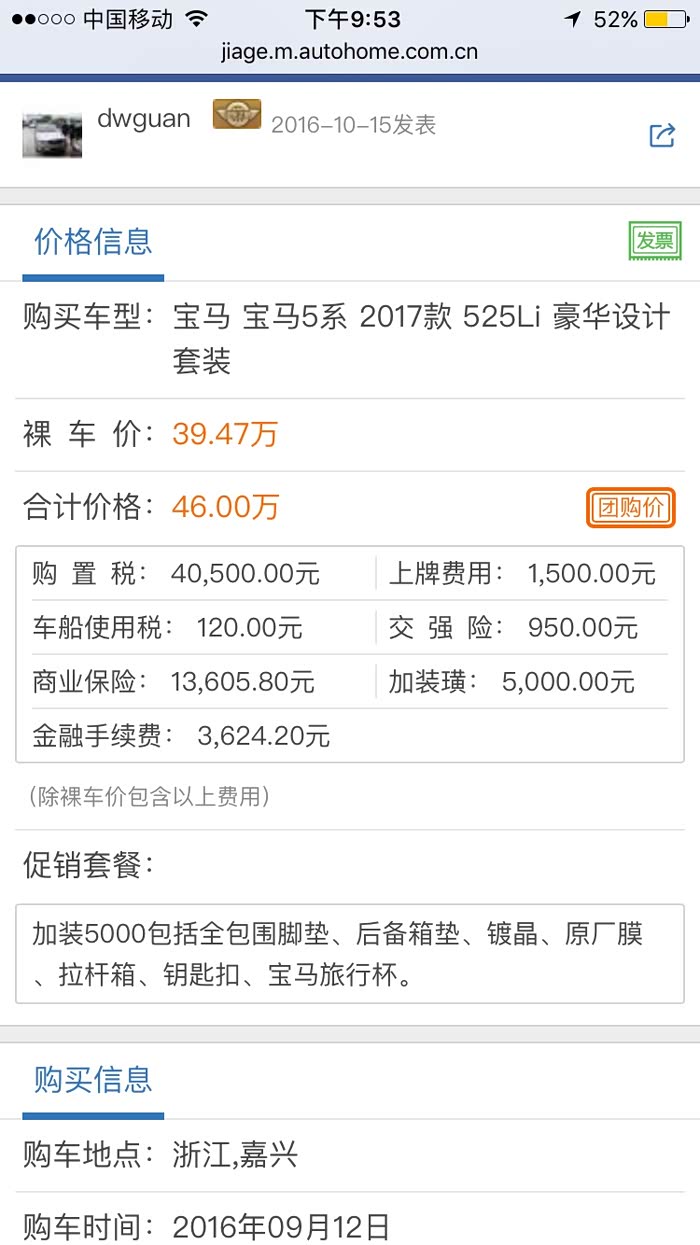确定了买什么车后,就一个人跑杭州一家4S问价格,17增配版、优惠18个点,加装18800,金融手续费5%,NND算下来52万,与汽车之家里最低的报价差很多嘛,我想叫他们报个实在的价格,价格可以的话我马上定车,***满满的都是套路呀,闪人;然后在万能的汽车之间网站找到了组织,加入了我们团购的群,跑遍杭城所有4S,一家一家的比价,最终确定46万以内搞定,不包括利息,本来在杭州一家4S店谈的差不多了,我们一行人准备签合同的,一个电话打给我堂弟的销售问他们能不能搞定,回复你先来,我这边马上申请,我们留一半人在杭州,一半人跑另一家4S,通过一个小时确认,可以,比杭州的更优惠,电话给留守在杭州的兄弟们一道跑到另一家4S签购车协议。
