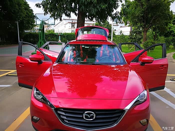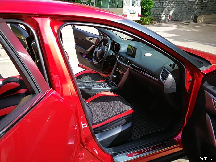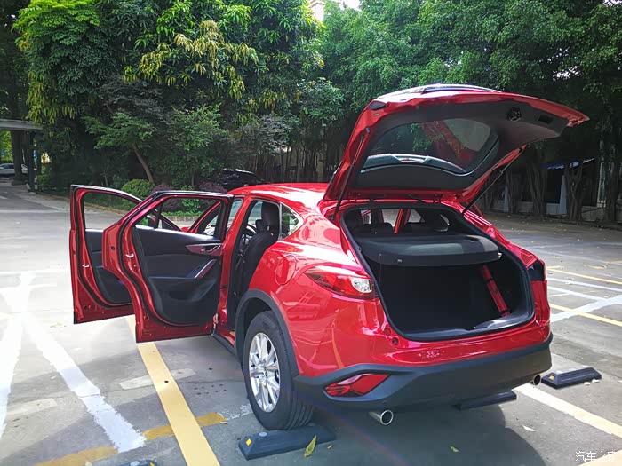 我买的是CX_4蓝天探索版,选了魂动红加了二千大洋。车子用了一个多月,里程约4000公里,目前的油耗约8.5升的样子(深圳的早晚高峰出行基本处于全程半拥堵状态)。车辆冷着车的时候发动机声音较大,但是平时上路还可以,当车开到100公里左右,发动机转速超过两千转后能明显的听到发动机的声音。动力嘛,不算迅猛,家庭代步够用,平时超车也不吃力。风噪方面我个人认为还是可以接受的,因为新车还没过首保,最快速度也就到100左右,所以没感觉太明显的风噪声。关于底盘,这部车整体开起来让人感觉是比较结实的,也就是说底盘很整,不松散。车底用了几块护板把底盘封闭起来了,这个在平民车里是很少见的,必须赞一个,在通过崎岖路面时能让人多一份自信。这部车的操控性很好,指向精准,驾驶起来完全没有开SUV的笨重感,更象是在开一部轿跑车,而更高的离地间隙让这台车拥有了良好的通过性(再也不用当心老婆嗑马路牙子了)