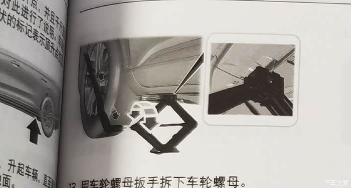 【网上有视频演示把漏气轮胎放倒,塞到车底千斤顶旁边,以防万一千斤顶倒下来好做个支撑,这个方法可以参考,但是手册上没有写。】