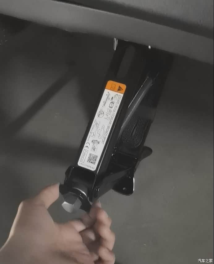 先逆时针拧动螺母,降低千斤顶高度,卸下自带的折叠扳手。折叠扳手上方是个弯钩,挂在千斤顶头部的一个小孔里面,下方则嵌在千斤顶底座的凸起中,只要稍微松动侧面螺母即可摘下扳手。扳手两头是可以180度折叠的。