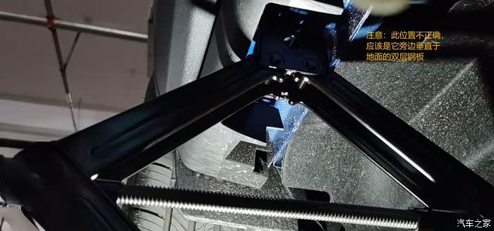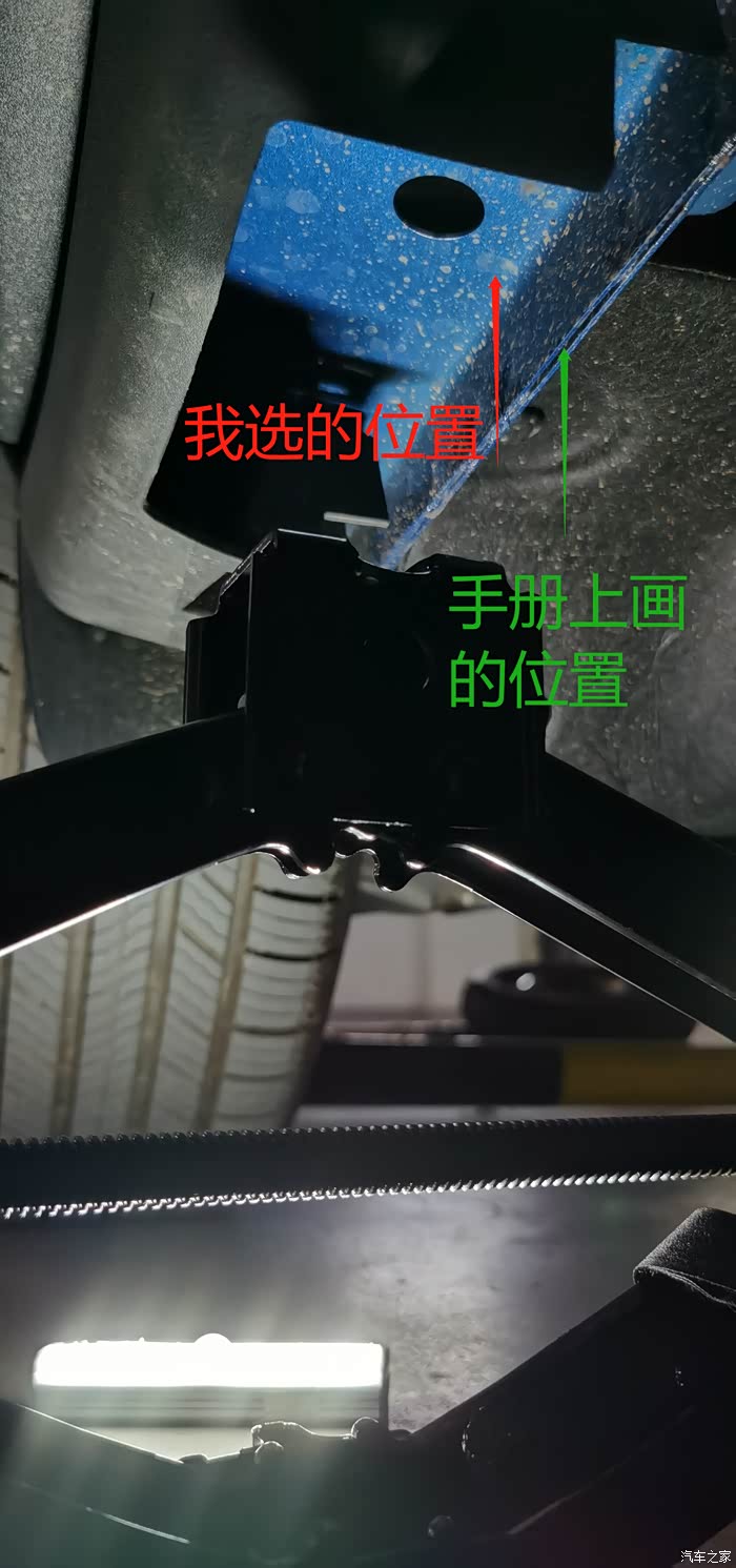 接下来,降低千斤顶的高度直到能够顺利塞进车底,然后就是寻找合适的举升点了,这里我犯了一个错误:提车之前一直看从网上下载的电子版说明书,示意图片不是很清晰,加上本人也算是汽车小白,理解有误,在车下寻找一番,觉得应该是那块凹进去的平面,于是就在那里动工了。见下图。