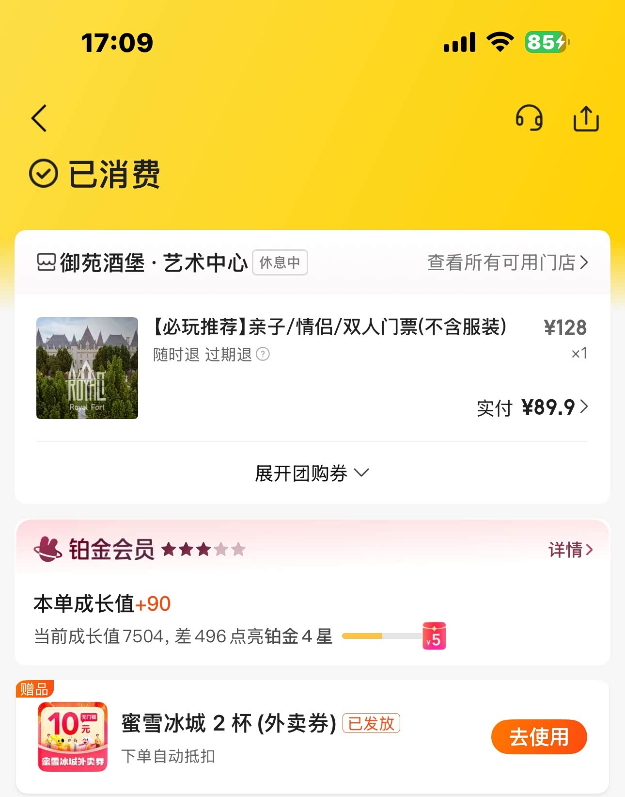 精打细算是美德,美团上89.9元购得双人门票,凭此还能在堡内咖啡厅享88折优惠,不错。