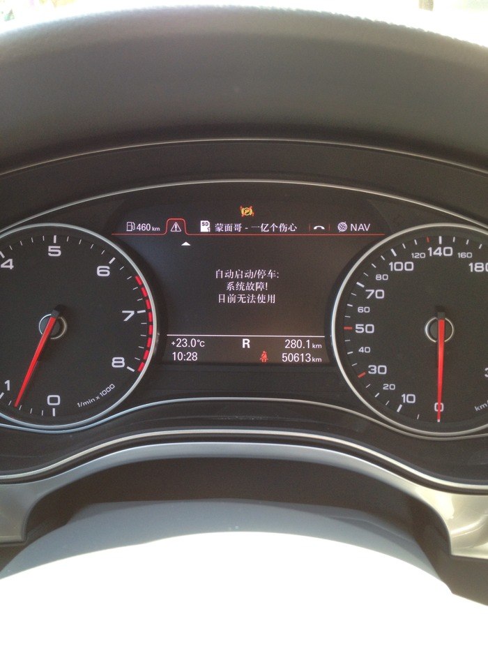 我倒没有你仪表上的提示,只是熄火时原来绿色的标志自己变成白色,中间还多了条斜杠,就是自动启停关闭的意思,可是我没关它啊!郁闷,今天一天就碰到两次了。