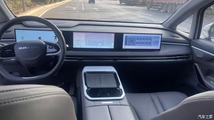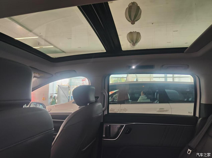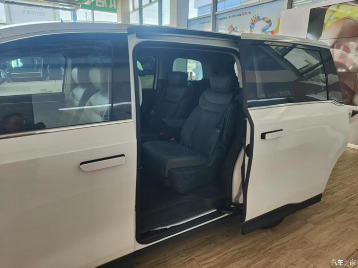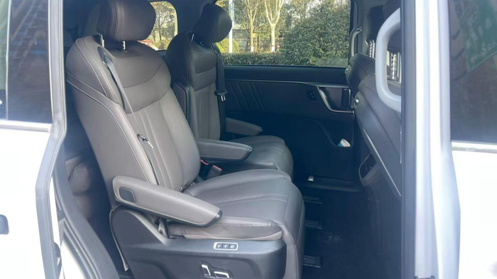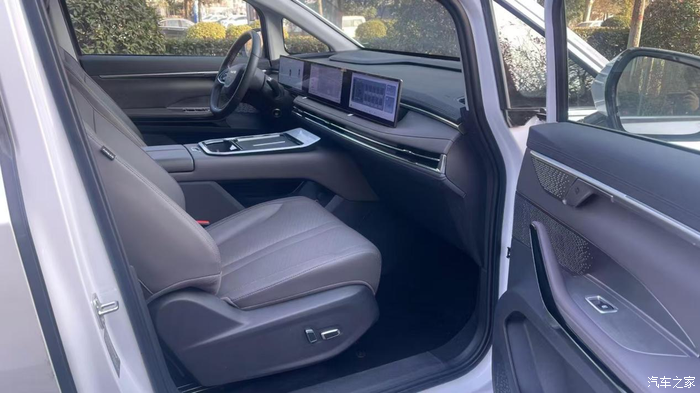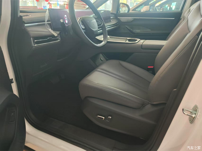 拉开车门的瞬间,这车内布局确实宽敞。第二排是带电动调节的独立航空座椅,腿托、加热、通风功能全配齐。我特意让儿子坐进去体验,坐着确实舒服。