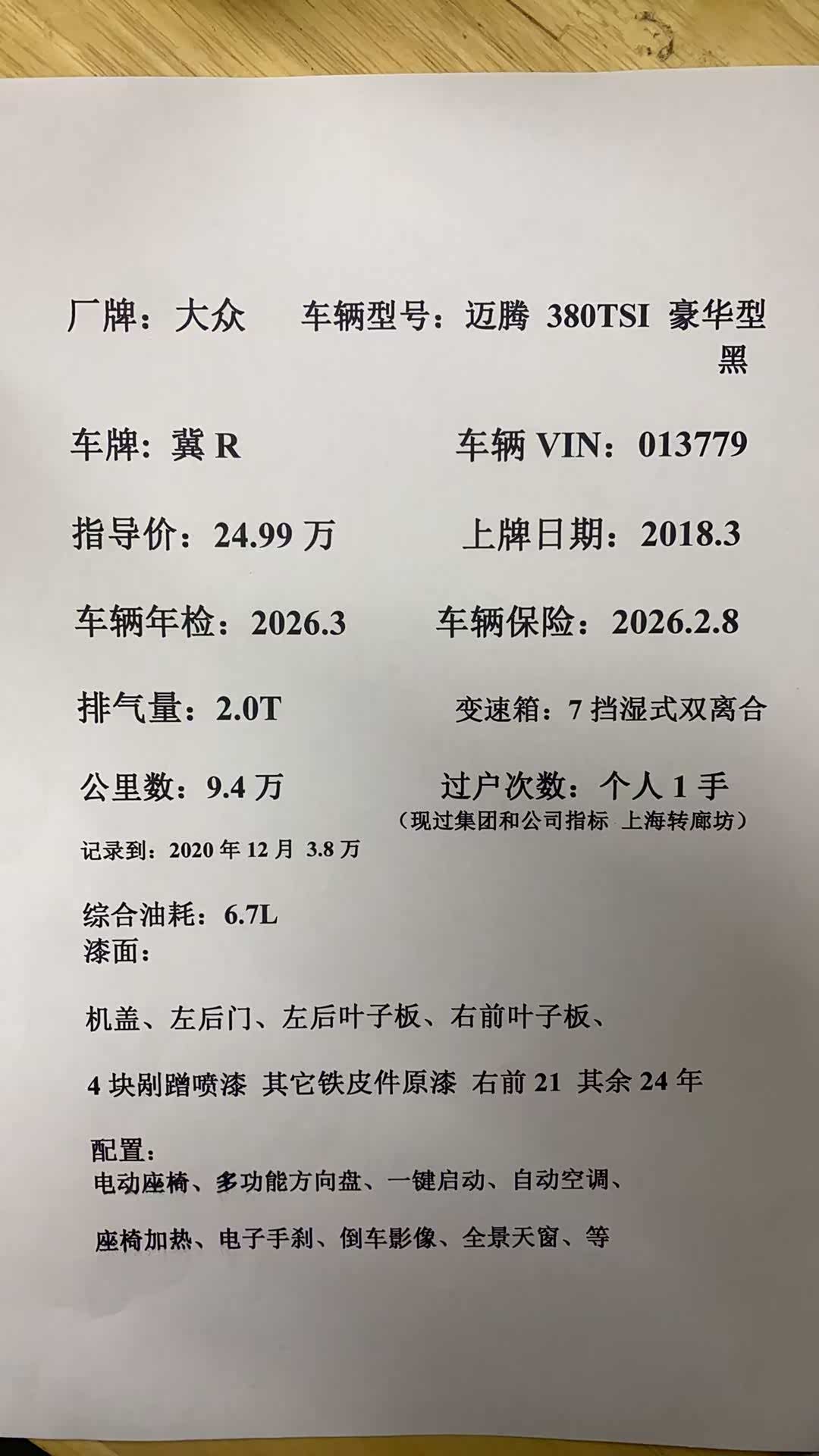 出售个人闲置18年迈腾380豪华,个人两手户,现在天津户,有意向的联系,保实表