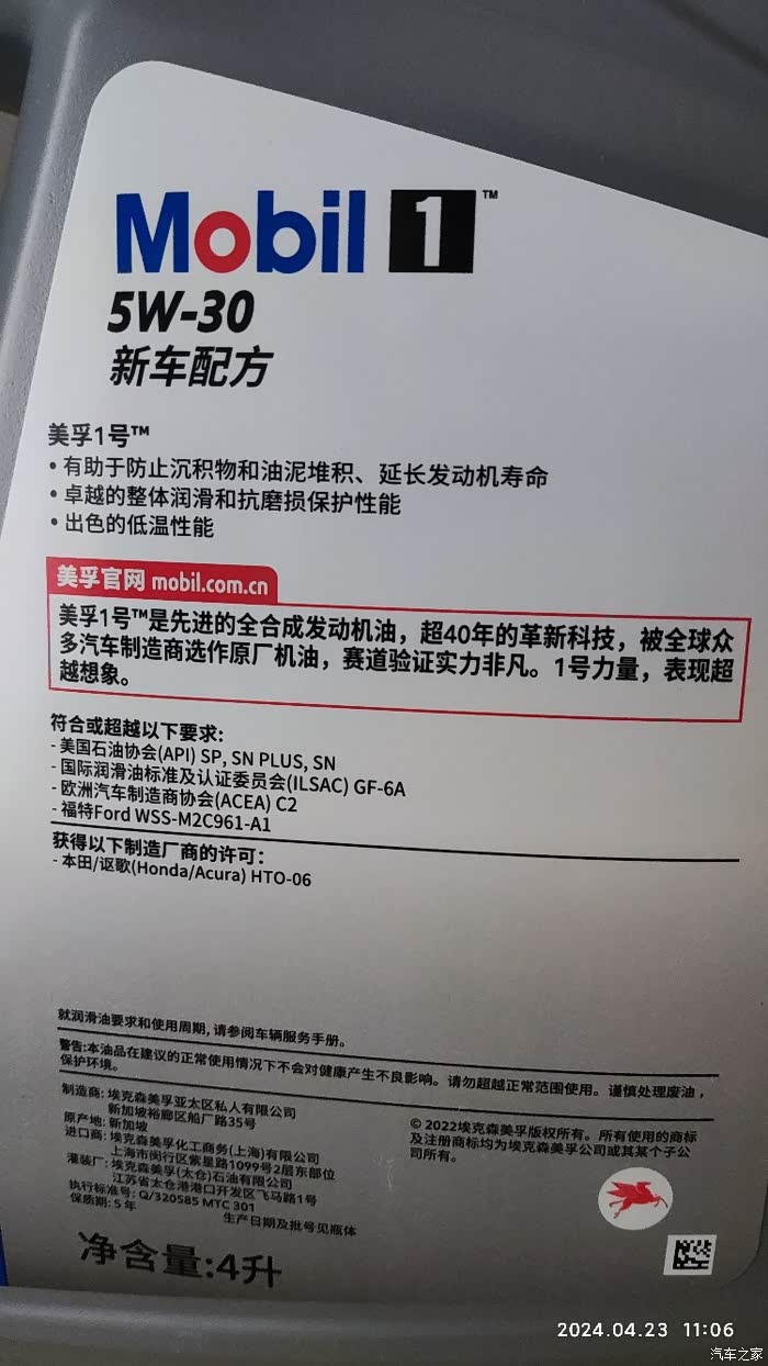 机油:美孚一号(上一辆油车用的壳牌,4s店用的嘉实多,所以这次打算试试美孚一号)